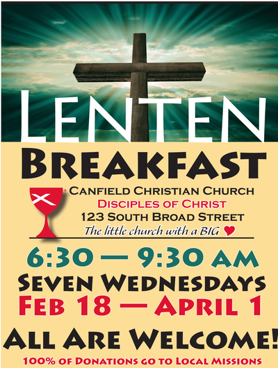 Lenten Breakfast is planned for every Wednesday February 18 through April 1. Come join us at Canfield Christian Church for FREE breakfast and fellowship. Menu varies weekly but eggs and sausage, sweets, and oatmeal are always included. Donations for missions cheerfully accepted!