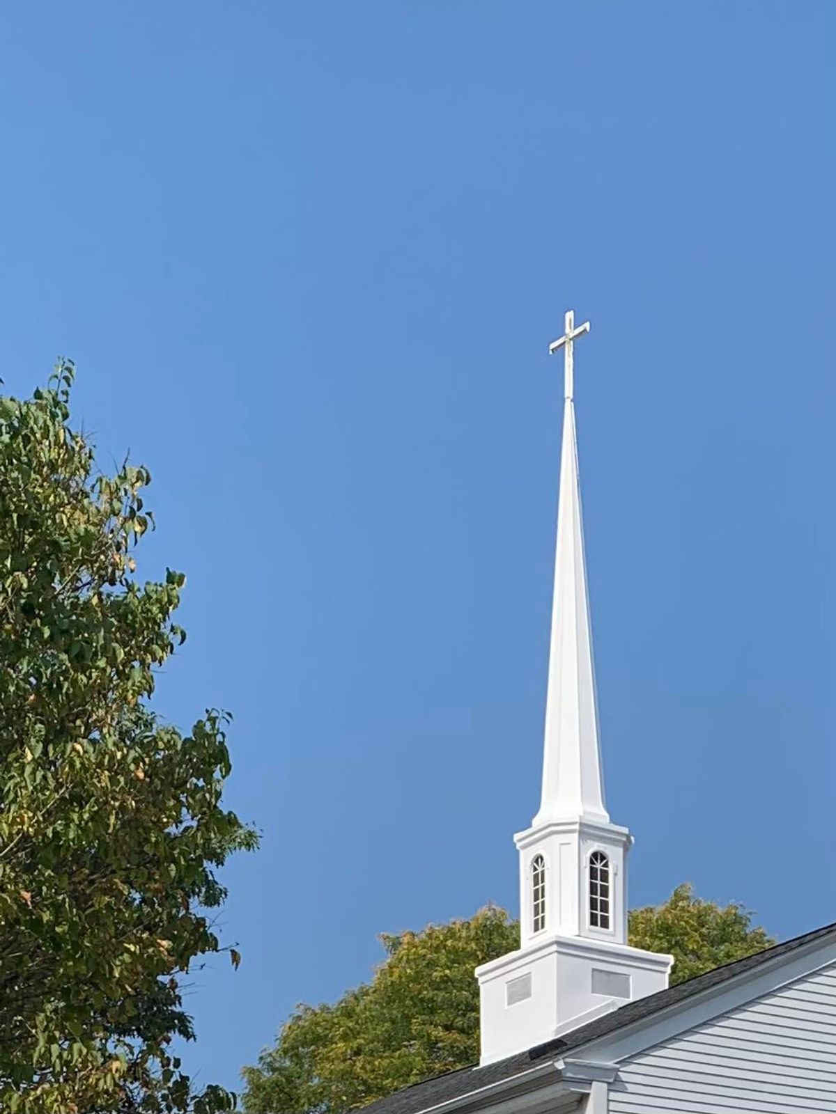 The newly cleaned church spire gleams from farther view